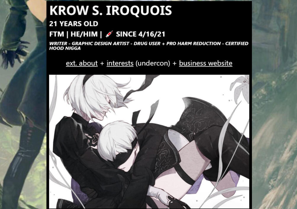 Hello. My name is Krow Iroquois, but you can just call me Krow. "Grim" is also an alias of mine that I go by from time to time. I am a 21-year-old, black, transgender man who was raised in the deep and dirty south of the US. I say that to say that even the most rugged of individuals can be super creative.Writing is my ultimate passion. I have been a writer for both fanfiction and original content for as long as I can remember. Throughout the years, I've flip flopped through quite a few fandoms. I don't write as much as I used to anymore, but I thought it wouldn't hurt to start back up again. So, here I am!Regardless of any reason I have behind creating my works—whether it be therapeutic, for spreading knowledge, or just for the hell of it—nearly everything I've written holds a special place in my heart. Something that will always keep me going is the feedback I receive on my works, and I thank every single person who has left any kudos or comments on my fanfiction.While I'm aware that most regard me as one of the greatest writers they've ever known, I am by no means a perfect one. I strive to become a better writer with each passing day. Unless otherwise stated, I will always accept any constructive criticism towards my works. I wouldn't have been able to improve as much as I have if it weren't for critique.With that being said, I hold other writers up to the same accountability and will often offer my constructive criticism with their consent. If I have ever made an error in my delivery, I admit all fault over it. My goal is to treat others the way I would want to be treated— with all due honesty and respect. I am aware that some of my critique may come off as "harsh" or "rough," but I truly don't mean any real harm by what I say; I just like to be as blunt and precise as possible.If you'd like to be friends or just have any type of casual conversation, don't be afraid to contact me. I'm a little awkward at first, but it shouldn't take long for me to warm up to you.